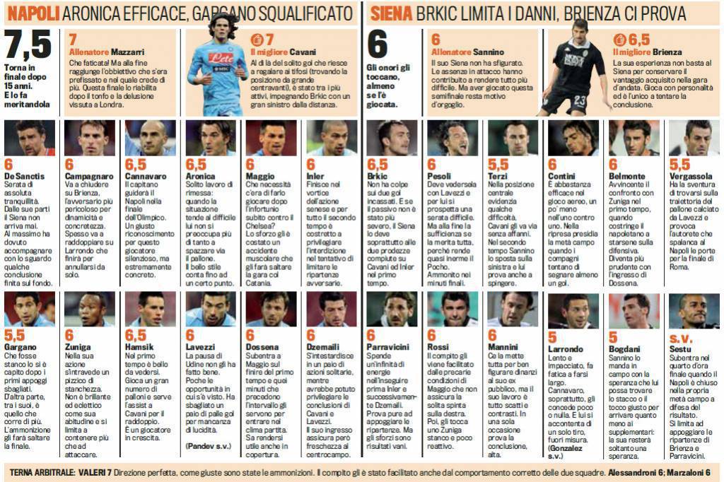 NAPOLI SIENA VOTI PAGELLE GAZZETTA – Il Napoli di Mazzarri si regala la finale di Coppa Italia vincendo due a zero contro il Siena nel ritorno della semifinale di Coppa Italia. All’andata era finita due a uno per il Siena. Il Napoli passa in vantaggio con un’autorete di Vergassola, il raddoppio arriva grazie a Cavani. Il Matador è il migliore in campo del Napoli, Brienza è l’uomo che crea maggiori pericoli per il Siena. Bene anche Hamsik che sta crescendo. Voti e pagelle della Gazzetta dello Sport.