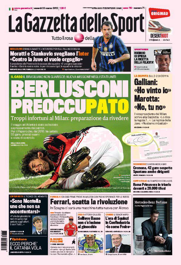 GAZZETTA BERLUSCONI PATO – Pato volerà negli Stati Uniti per cercare di guarire dai suoi malanni fisici. Berlusconi preoccupato.