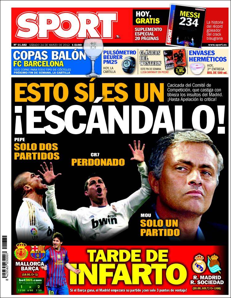 SPORT SCANDALO – Sul quotidiano Sport si commentano le squalifiche inflitte al Real Madrid. Secondo il quotidiano catalano troppo poche le giornate per Pepe, Mourinho.