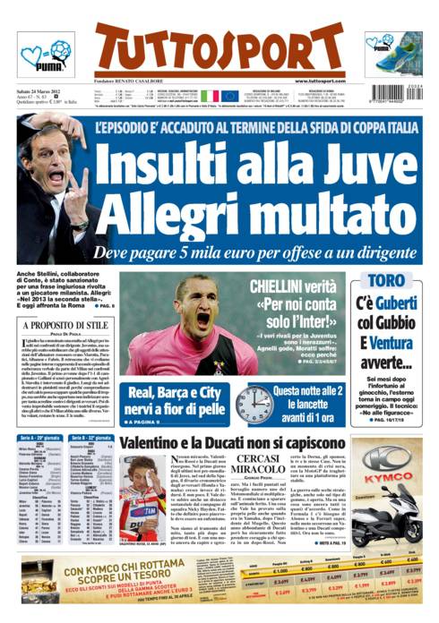 TUTTOSPORT JUVENTUS – Allegri, tecnico del Milan, è stato multato per insulti a un dirigente della Juventus.
