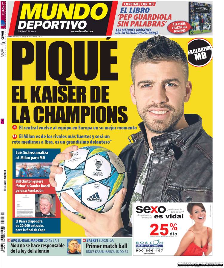 MUNDO DEPORTIVO PIQUE’ CHAMPIONS – Sul quotidiano Mundo Deportivo si parla di Piquè, difensore spagnolo del Barcellona.