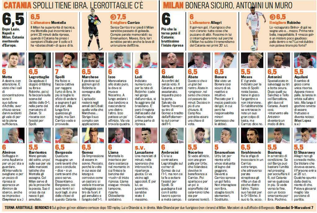 CATANIA MILAN VOTI PAGELLE GAZZETTA DELLO SPORT FOTO – Si continuerà a parlare a lungo del gol fantasma non concesso a Robinho, sul salvataggio di Giovanni Marchese. Il Milan ha di che lamentarsi al termine del match Catania-Milan, disputatosi ieri pomeriggio allo stadio Massimino e finito per una rete ad una. Analizzando velocemente la partita, salta all’occhio l’ottima prova dei rossazzurri, ormai vera rivelazione del campionato di Serie A: a larghi tratti, gli Etnei, hanno fatto valere il proprio gioco, dimostrando grande carattere e qualità. In alto potete trovare i voti e le pagelle della Gazzetta dello Sport.