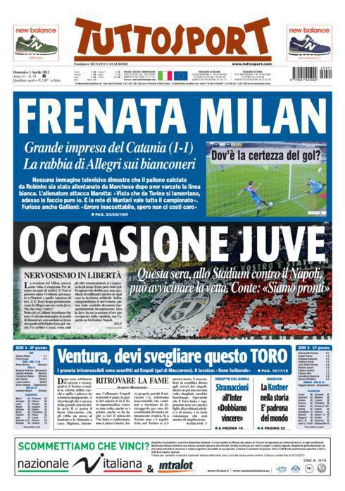 TUTTOSPORT MILAN JUVENTUS – Tuttosport, stamani, apre sulla frenata del Milan, squadra che è uscita con un pareggio, tra le polemiche, dallo stadio Massimino. Saprà la Juventus portarsi a meno 2?