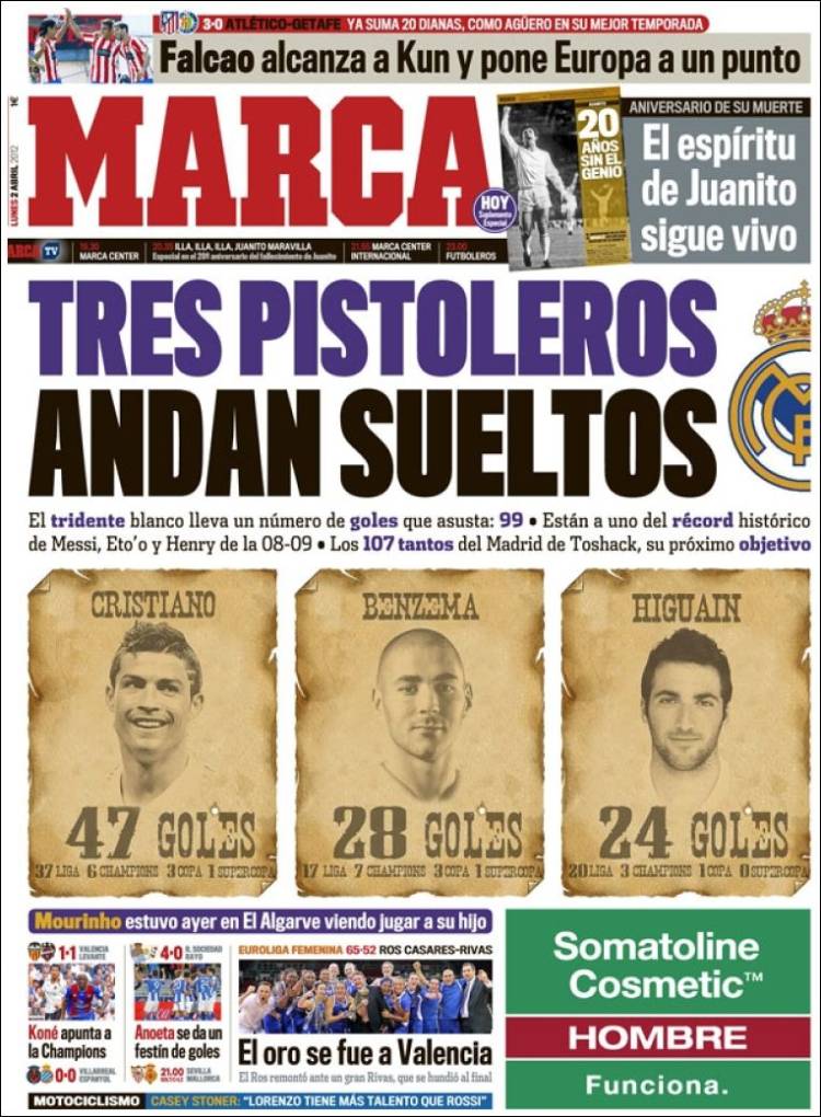 MARCA REAL MADRID – Sul quotidiano Marca si parla del trio del Real Madrid Ronaldo-Benzema-Higuain, che in questa stagione hanno segnato in totale 99 gol.
