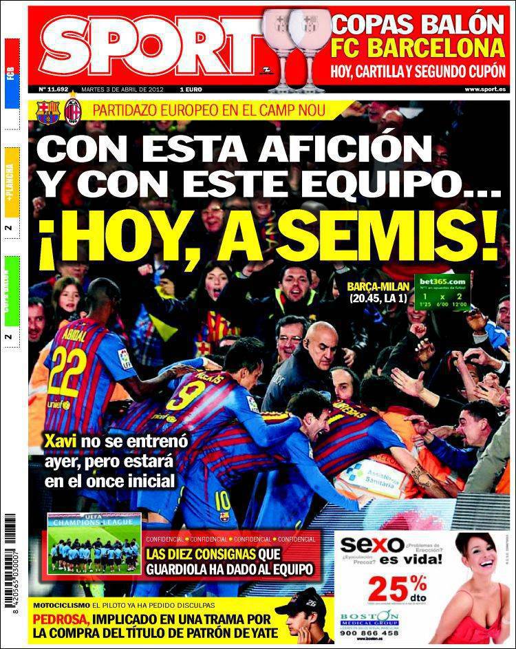 SPORT SEMIFINALE – Il quotidiano Spagnolo Sport, si sbilancia addirittura sulla partita di stasera tra Barcellona e Milan che viene definita come una semifinale anicipata.