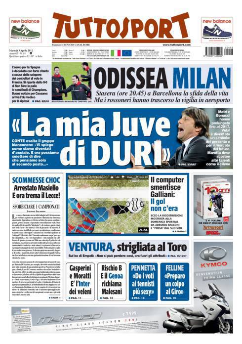 TUTTOSPORT JUVE DURI – Un Antonio Conte raggiante quello ripreso quest’oggi dal quotidiano Torinese Tuttosport. Una squadra fatta di duri che, al momento, ha la migliore difesa d’europa.