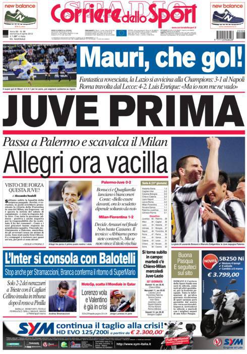CORRIERE DELLO SPORT PRIMA PAGINA – Anche il Corriere dello Sport regala il titolone principale al ritorno in testa alla classifica della Juventus.