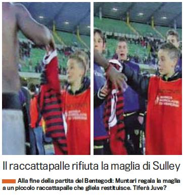 FOTONOTIZIA – Simpatico siparietto accaduto al termine della sfida fra il Chievo e il Milan giocatasi ieri sera al Bentegodi. Al termine del match il centrocampista rossonero, Sulley Muntari, ha regalato la propria maglia ad un bimbo raccattapalle… che gliel’ha restituita. Di seguito lo scatto pubblicato da La Gazzetta dello Sport che si domanda per quale squadra tifi il ragazzino.
