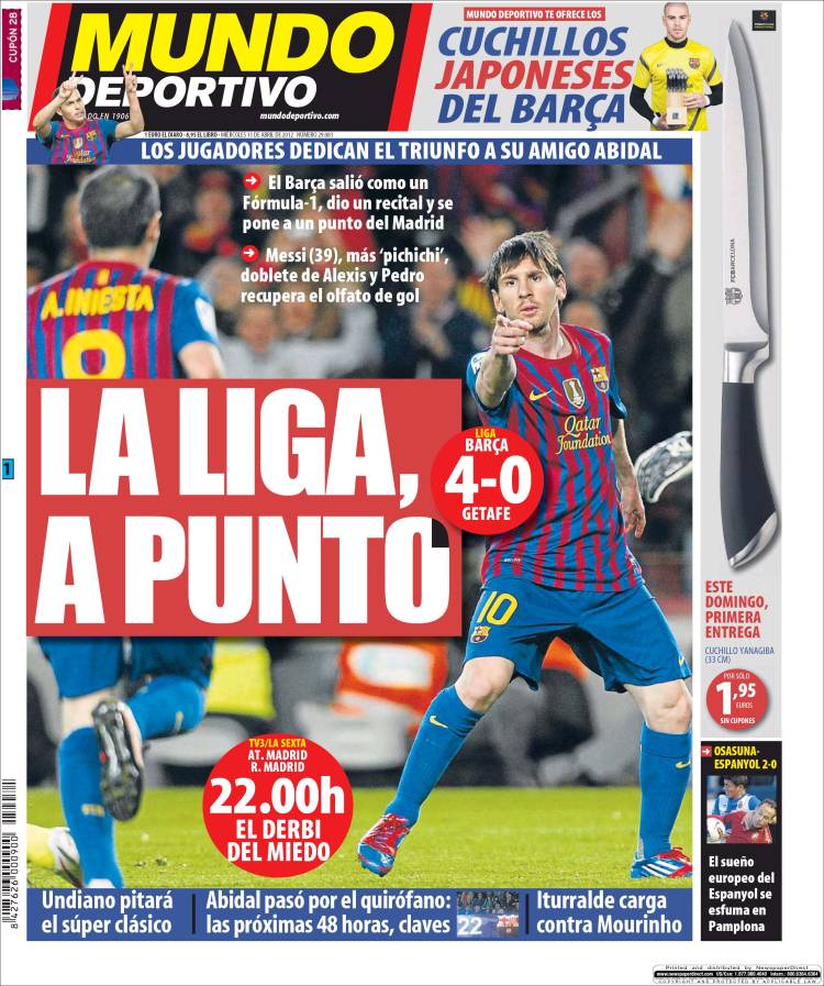 MUNDO DEPORTIVO LIGA – Sul quotidiano Mundo Deportivo si parla del Barcellona che vincendo quattro a zero contro il Getafe si porta a un punto dal Real Madrid.