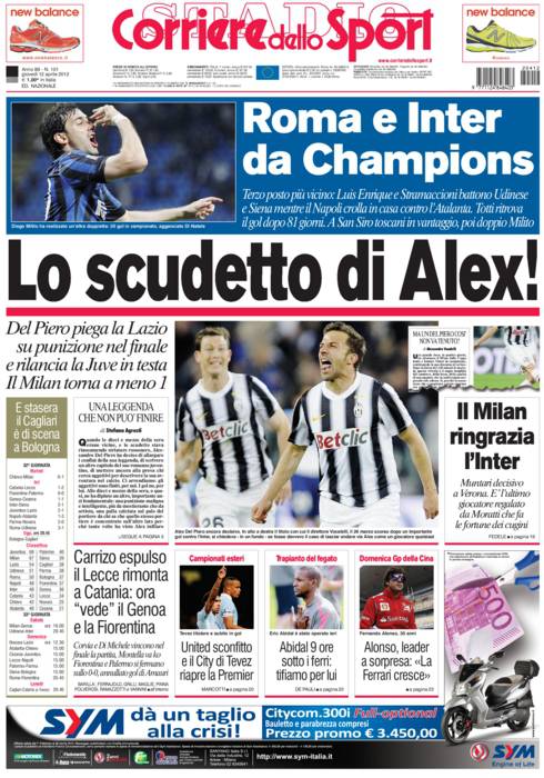 CORRIERE DEL PIERO – Anche il Corriere dello Sport elogia Alessandro Del Piero autore del gol decisivo contro la Lazio.