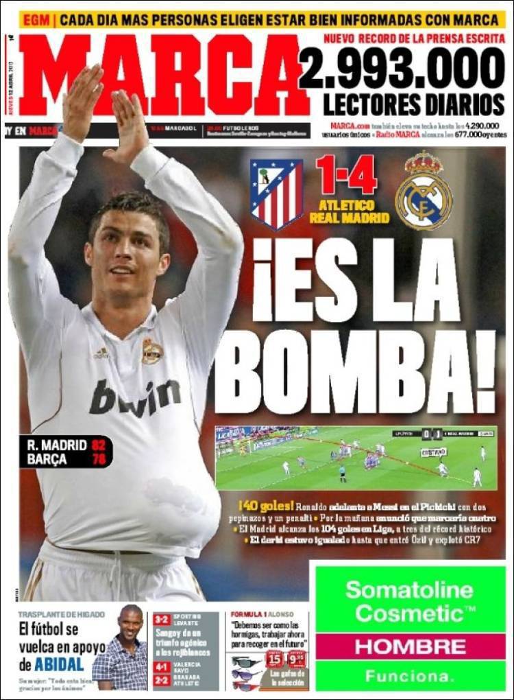 MARCA RONALDO – Sul quotidiano Marca si parla del Real Madrid che vince quattro a uno contro l’Atletico Madrid e si porta a più quattro sul Barcellona.