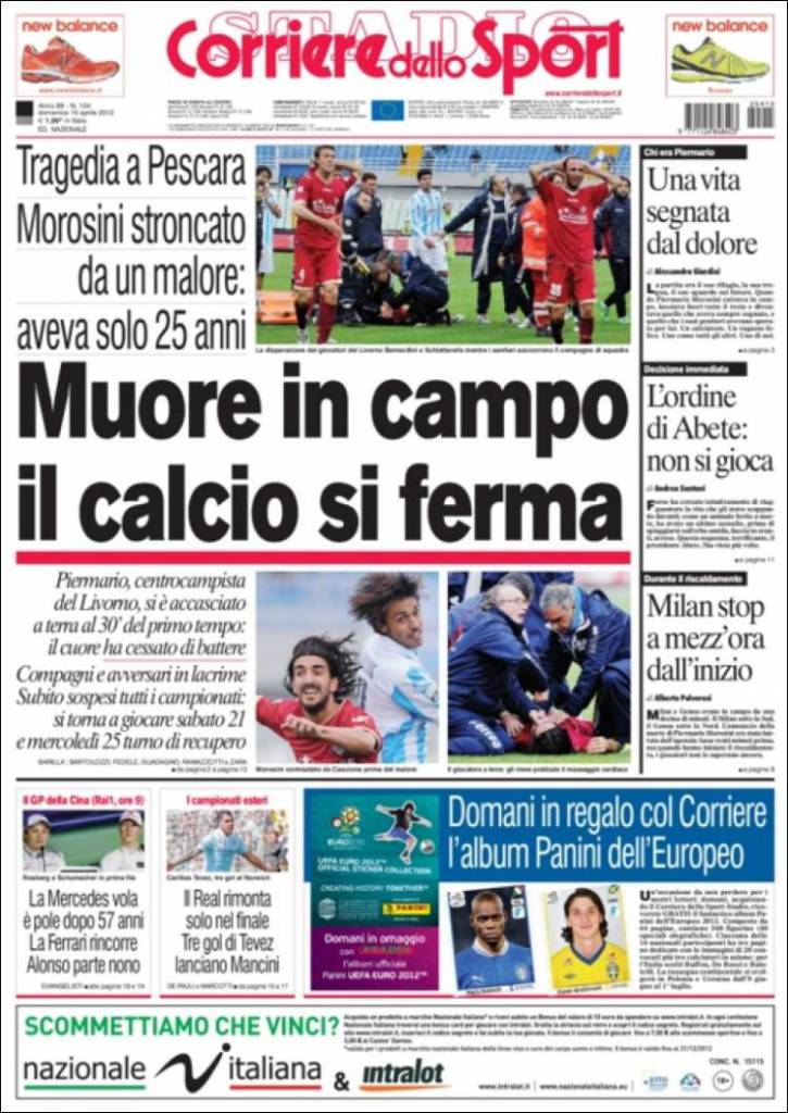 CORRIERE DELLO SPORT MUORE IN CAMPO CALCIO – Anche il Corriere dello Sport, si sofferma sull’addio al compianto Piermario Morosini, centrocampista del Livorno, scomparso nella giornata di ieri durante la partita Pescara-Livorno.