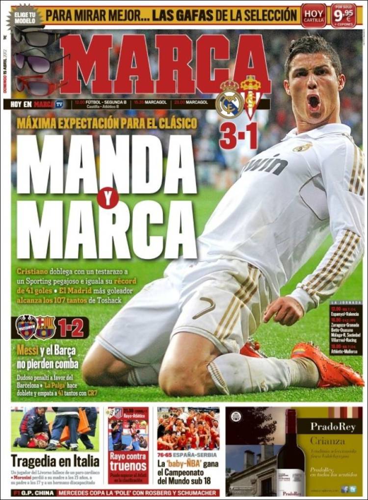 MARCA MANDA MARCA – In una domenica dove risulta molto difficile in Italia parlare di Calcio, il quotidiano Spagnolo Marca, dedica la prima pagina a Cristiano Ronaldo, protagonista del match di ieri sera che ha visto il Real Madrid trionfare contro lo Sporting Gijon.