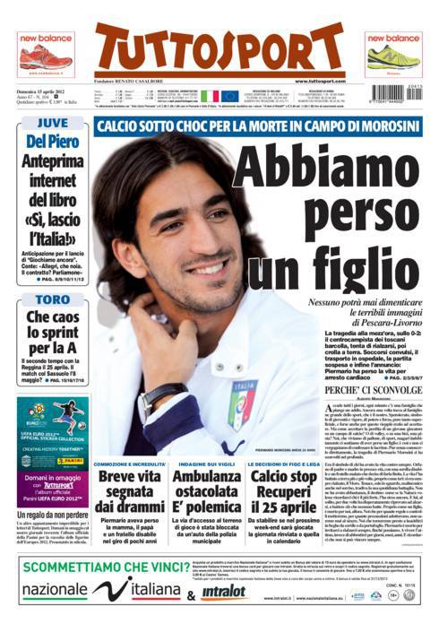 TUTTOSPORT ABBIAMO PERSO UN FIGLIO – Un primo piano del compianto Piermario Morosini, apre l’edizione odierna di Tuttosport. Tragedie così, siamo certi, non dovrebbero mai accadere.