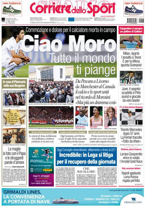 CORRIERE MOROSINI – Anche il Corriere dello Sport omaggia Morosini del Livorno, sfortunato giocatore stroncato da un arresto cardiaco sabato pomeriggio.