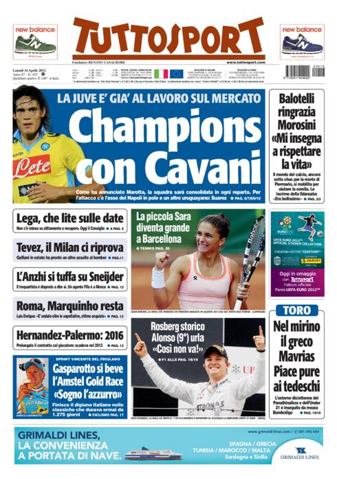 TUTTOSPORT CAVANI – Su Tuttosport si parla invece di Juventus con l’assalto a Cavani in vista della Champions League.