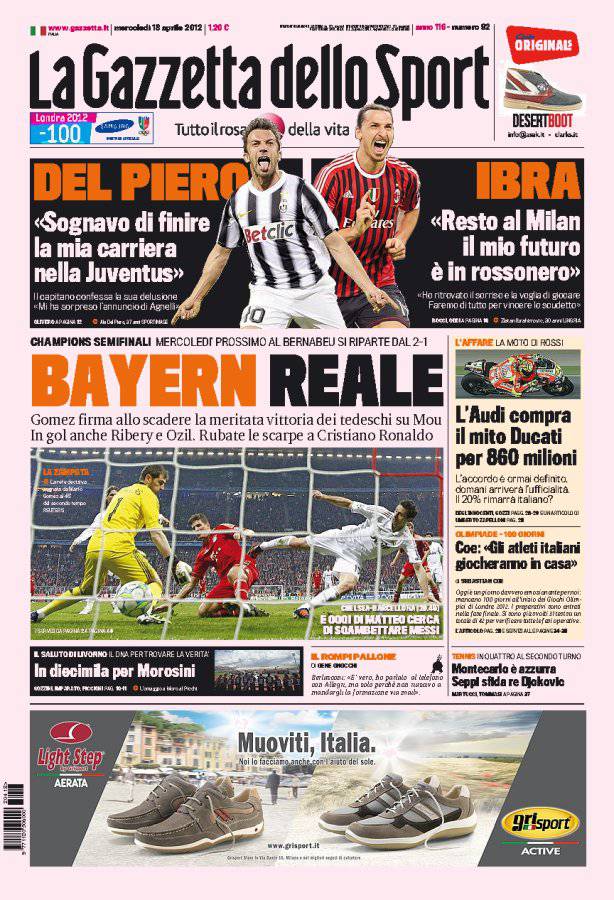 GAZZETTA BAYERN REAL – Sulla Gazzetta dello Sport si parla del Bayern che vince due a uno il Real Madrid nella semifinale d’andata di Champions League.