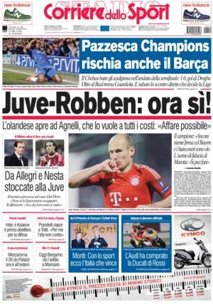 Corriere dello Sport: Juve-Robben, ora si! 19/04/2012 di admin CORRIERE JUVENTUS ROBBEN – Sul Corriere dello Sport si parla del mercato Juventus con l’arrivo di Robben. La redazione di Calciomercatonews.com