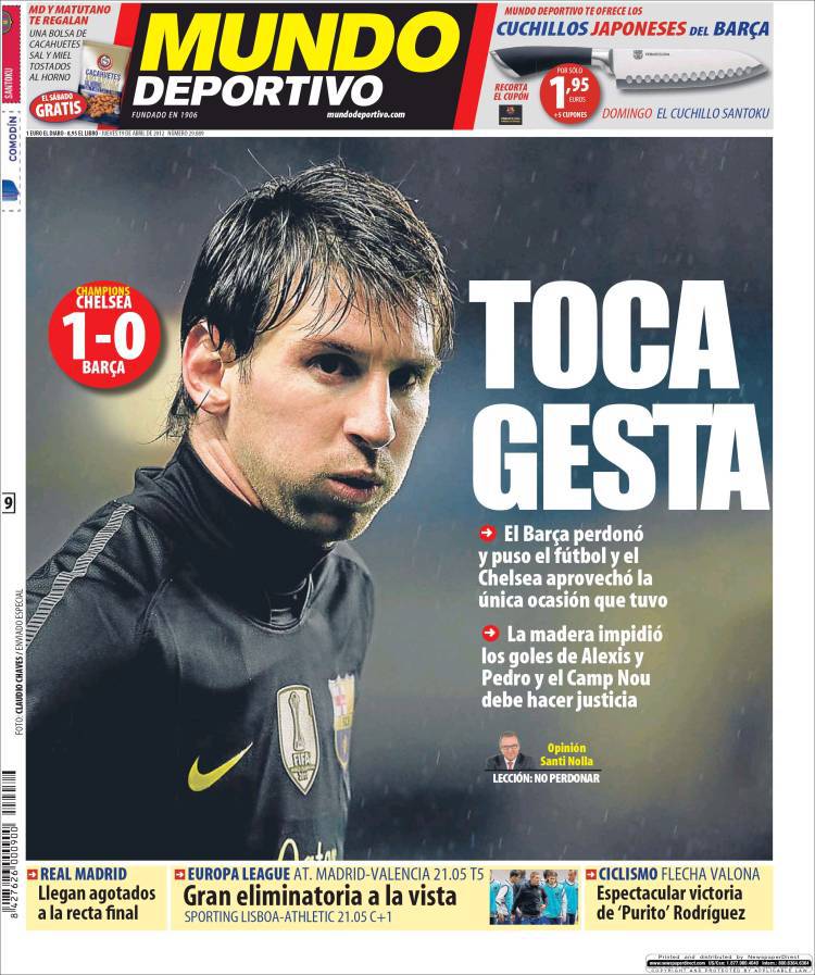 Mundo Deportivo: Serve l’impresa 19/04/2012 di admin MUNDO DEPORTIVO BARCELLONA – Il quotidiano Mundo Deportivo parla del Barcellona che al ritorno contro il Chelsea dovrà cercare l’impresa. La redazione di Calciomercatonews.com