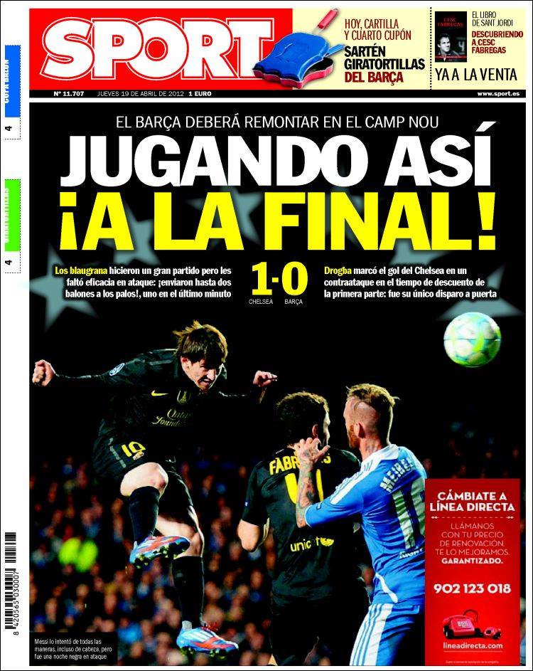 Sport: Giocando così si va in finale! 19/04/2012 di admin SPORT BARCELLONA – Sul quotidiano Sport si parla del Barcellona che ieri ha perso uno a zero contro il Chelsea ma ha giocato bene. La redazione di Calciomercatonews.com