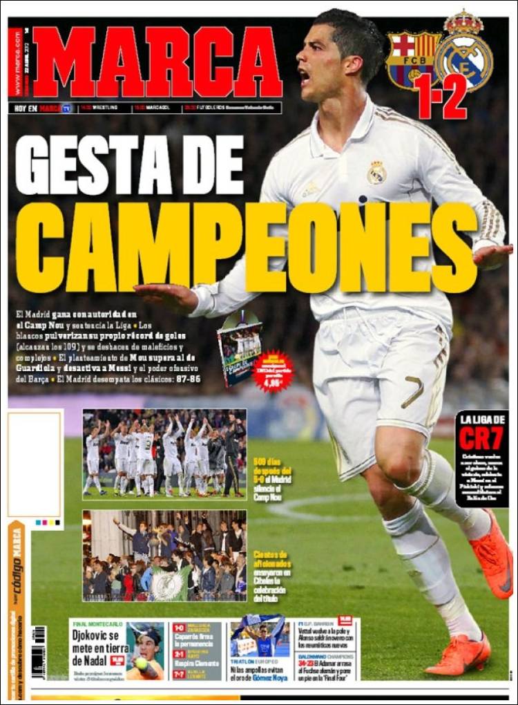 MARCA GESTA CAMPIONI – Il quotidiano Spagnolo Marca, apre sulla vittoria del Real Madrid al Camp Nou di ieri sera. Una vittoria che regala virtualmente il titolo alla squadra di Josè Mourinho.