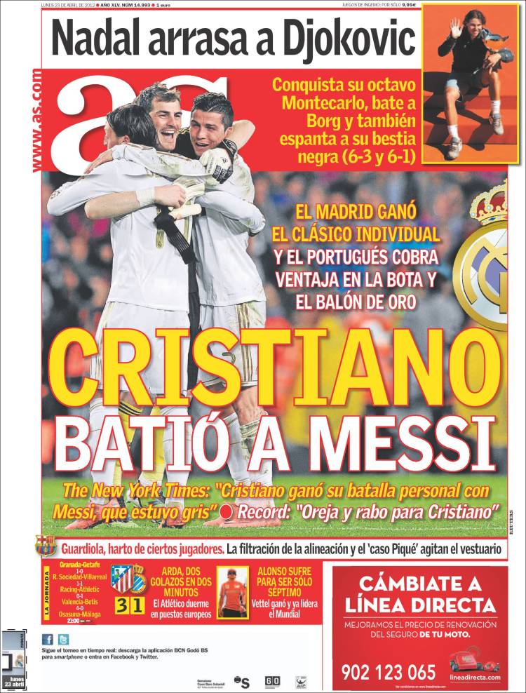 AS RONALDO MESSI – Cristiano Ronaldo ha battuto Messi. Molti quotidiani sportivi hanno elogiato il portoghese.