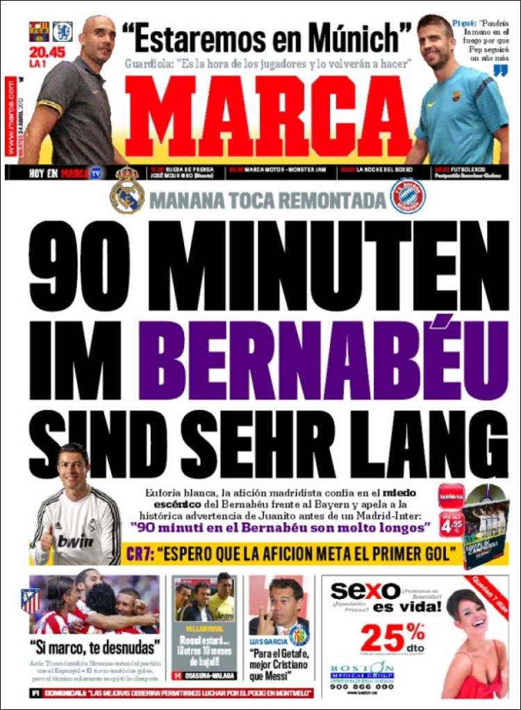 MARCA REAL MADRID – Sul quotidiano Marca si parla della semifinale di ritorno di Champions League tra Real Madrid e Bayern Monaco. I madrileni devono recuperare il due a uno di Monaco.