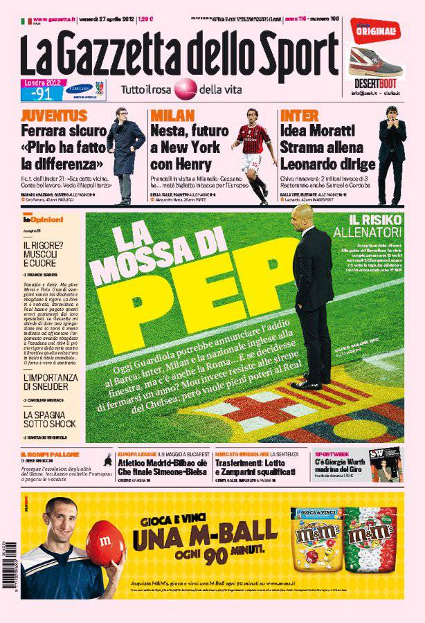 GAZZETTA GUARDIOLA – Sulla Gazzetta dello Sport si parla di Guardiola che oggi potrebbe dire addio al Barcellona.