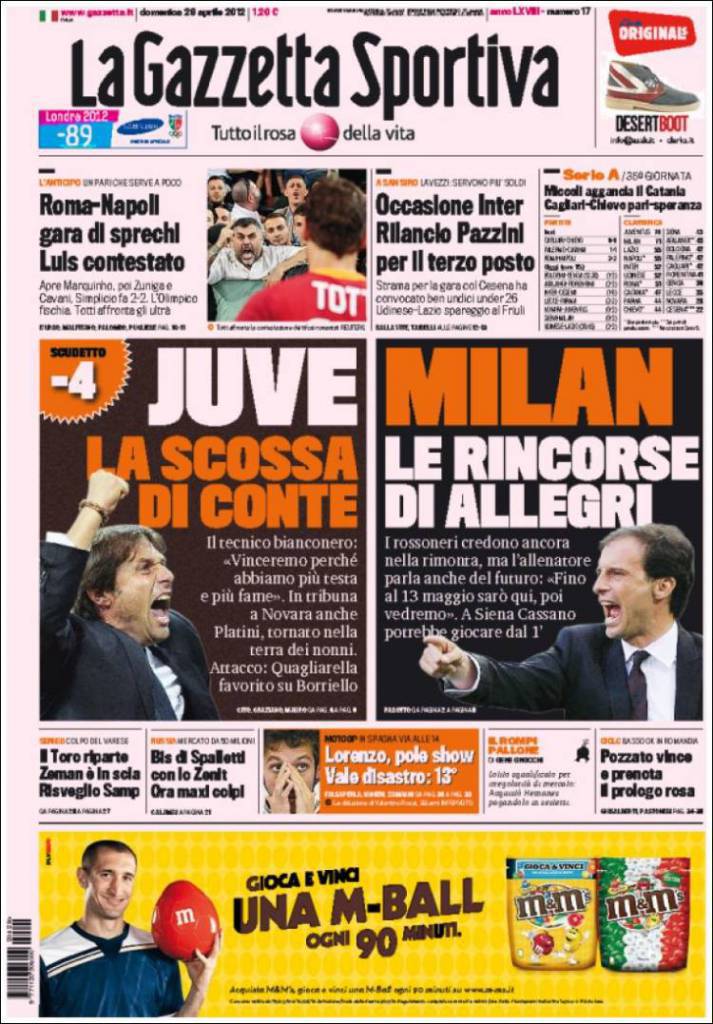 GAZZETTA DELLO SPORT JUVE CONTE MILAN ALLEGRI – Meno 360 minuti alla conclusione del campionato. La Gazzetta dello Sport dedica oggi la prima pagina alla corsa scudetto tra Juventus e Milan. Chi la spunterà il 13 Maggio?