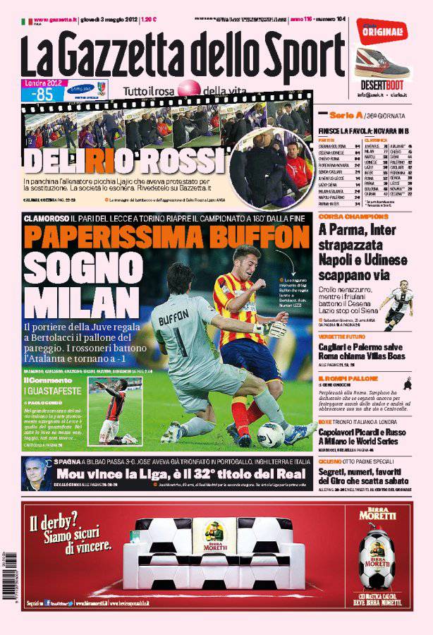 GAZZETTA BUFFON MILAN – Sulla Gazzetta dello Sport si parla di Buffon che da il via libera al gol del pareggio del Lecce. Milan a -1 dalla Juventus.
