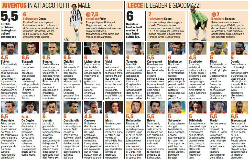 JUVENTUS LECCE VOTI PAGELLE GAZZETTA FOTO – Clamoroso quello che è successo ieri allo Juventus Stadium tra la Juventus di Conte e il Lecce di Cosmi. I bianconeri passano in vantaggio dopo otto minuti con Marchisio su assist fantascientifico di Pirlo, migliore in campo. La partita è controllata dalla Juventus che gioca gran parte del secondo tempo in superiorità numerica grazie all’espulsione di Cuadrado. Nel finale però succede il pasticcio di Buffon che si fa soffiare la palla da Bertolacci che deposita la palla nella porta sguarnita. Voti e pagelle della Gazzetta dello Sport.