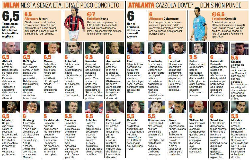 MILAN ATALANTA VOTI PAGELLE GAZZETTA FOTO – Il Milan vince due a zero contro l’Atalanta e si avvicina alla Juventus ora avanti di un solo punto. I rossoneri non giocano molto bene, Ibrahimovic è molto impreciso sotto rete. Ci pensa Muntari a sbloccare il risultato su assist di Boateng. L’Atalanta ci prova con Denis in più occasioni ma è attento Abbiati che svetta il pericolo. Nel finale ancora Ibrahimovic non riesce a trovare la via del gol, ci pensa allora Robinho a chiudere la partita con il due a zero finale. E intanto sugli spalti si esulta per il gol del pareggio del Lecce. Voti e pagelle della Gazzetta dello Sport.