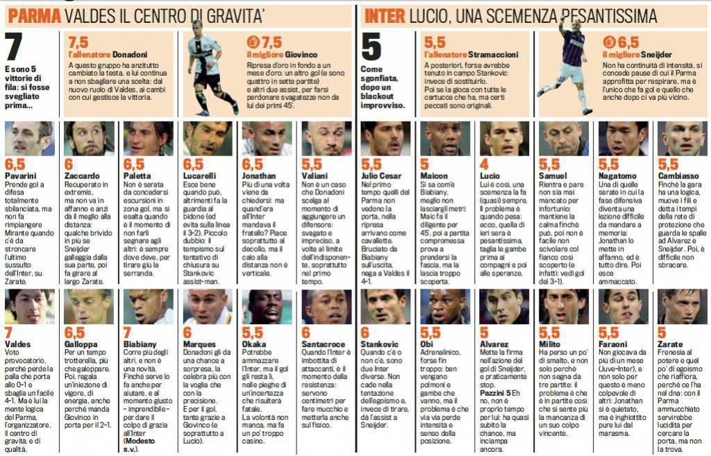 PARMA INTER VOTI PAGELLE GAZZETTA FOTO – Parma-Inter verrà ricordata per le magie di Sebastian Giovinco e anche per gli orrori di Lucio. Il primo ha portato il Parma alla vittoria, la quinta consecutiva, il secondo ha dato il via libera al pareggio dei ducali con un errore assurdo. Nel primo tempo solo Inter, la squadra di Stramaccioni passa in vantaggio con Sneijder. Nella ripresa l’errore di Lucio apre la strada a Giovinco che mette dentro per Marques. Poi arrivano i gol di Giovinco e Biabiany, sempre su errori della difesa. Voti e pagelle della Gazzetta dello Sport.