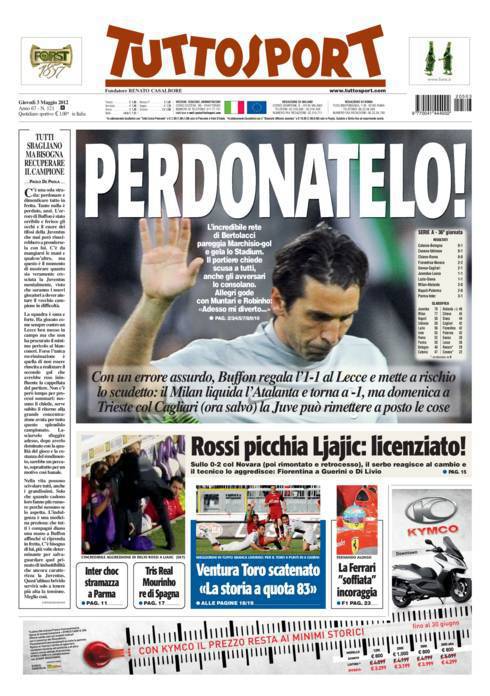 TUTTOSPORT JUVENTUS – Su Tuttosport si parla di Buffon che ha fatto un grande errore sul pareggio del Lecce.