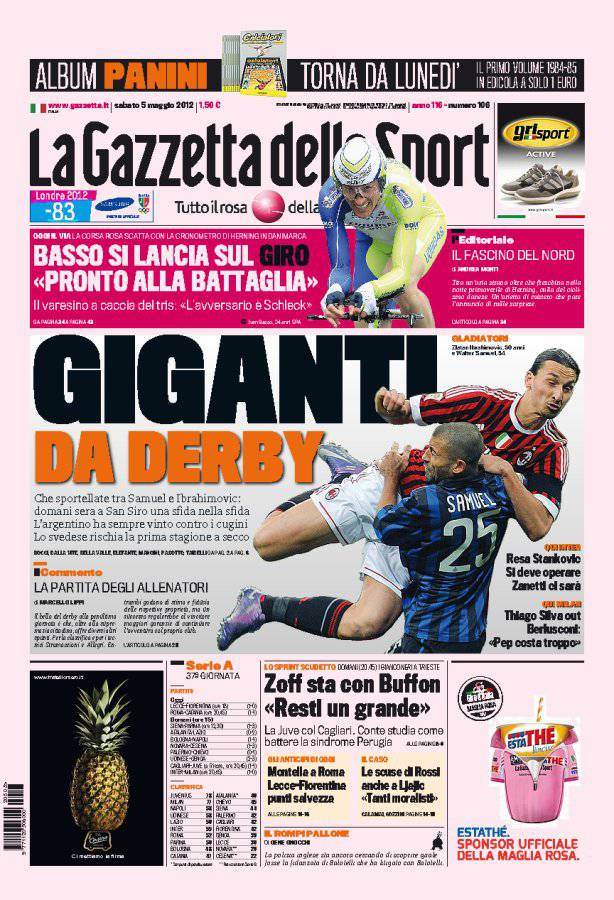 GAZZETTA GIGANTI – Sulla Gazzetta dello Sport si parla del derby tra Inter e Milan.