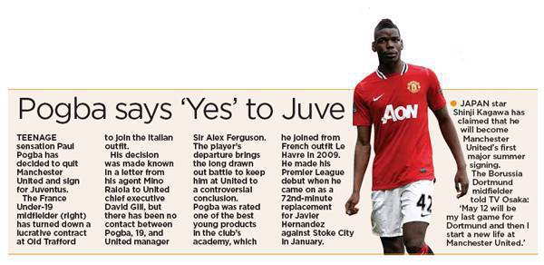 CALCIOMERCATO JUVENTUS – Sembra fatta per il trasferimento di Paul Pogba dal Manchester United alla Juventus. Ne è convinta la stampa britannica ed in particolare il Daily Mail edizione domenicale. Pogba ha il contratto in scadenza fra poche settimane, il prossimo 30 giugno, ed ha deciso di salutare i Red Devils visto il pochissimo spazio trovato in prima squadra in quel dell’Old Trafford. Di seguito potete leggere l’articolo originale publicato questa mattina dal Daily Mail naturalmente in lingua originale inglese: buona lettura!