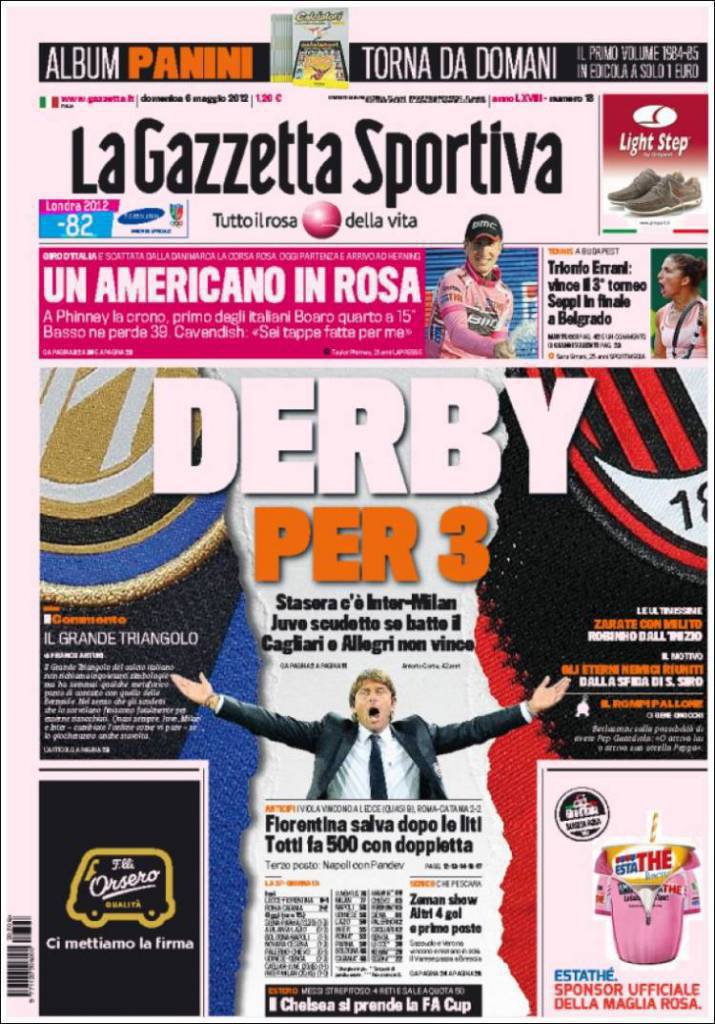 GAZZETTA DELLO SPORT DERBY PER 3 – Alle 22.30 di questa sera, la corsa scudetto potrebbe essere definitivamente decisa. A Milano infatti si giocherà il derby, definito dalla Gazzetta dello Sport: “Un derby per 3”.