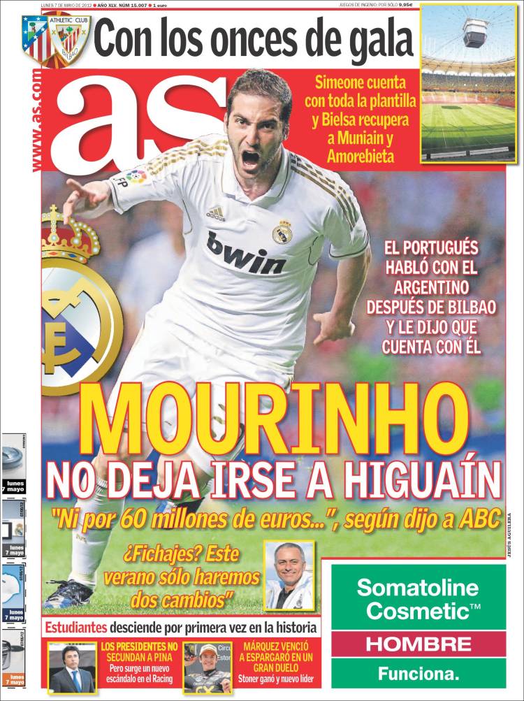AS MOURINHO HIGUAIN – Anche il quotidiano As parla di Higuain, bomber del Real Madrid, che Mourinho considera incedibile.