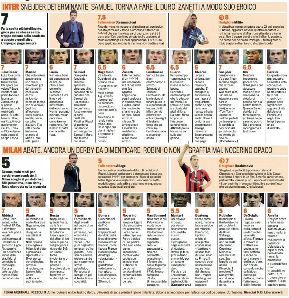 INTER MILAN VOTI PAGELLE GAZZETTA – L’Inter vince quattro a due il derby di Milano contro il Milan e fa un grande favore alla Juventus che festeggia la vittoria del 28esimo Scudetto. I nerazzurri dominano in lungo e in largo il match contro i rossoneri, con Stramaccioni perfetto tatticamente e un super Milito autore di tre gol. Nel Milan solo Ibrahimovic accende la luce segnando una grande doppietta. E’ festa Inter ma soprattutto Juventus. Tra i nerazzurri bene Maicon, Sneijder, Samuel e Julio Cesar. Nel Milan molte insufficienze. Voti e pagelle della Gazzetta dello Sport.