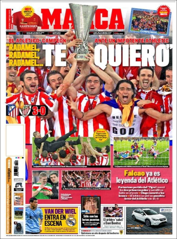 MARCA FALCAO – Sul quotidiano Marca si parla di Falcao, attaccante dell’Atletico Madrid, autore di una doppietta decisiva nella finale di Europa League contro l’Atletico Bilbao.