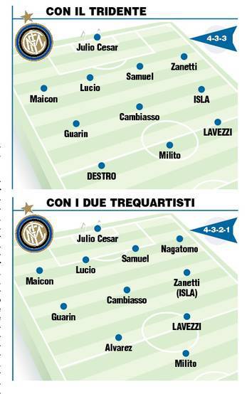 CALCIOMERCATO INTER STRAMACCIONI LAVEZZI FOTO – L’Inter pensa fortemente a Ezequiel Lavezzi, attaccante argentino classe 85′ che gioca nel Napoli. Il campione sudamericano permetterebbe a Stramaccioni di giocare in due modi possibili. Tuttosport ha infatti riportato i possibili schieramenti con Lavezzi in squadra. Il primo schieramento riporta Lavezzi come esterno nel tridente con Destro e Milito e Isla a centrocampo assieme a Guarin e Cambiasso. Il secondo schieramento prevede i due trequartisti, con Alvarez e Lavezzi assieme dietro un’unica punta ovvero Milito. A centrocampo entrerebbe Zanetti con Nagatomo come terzino sinistro. Ecco le due foto.
