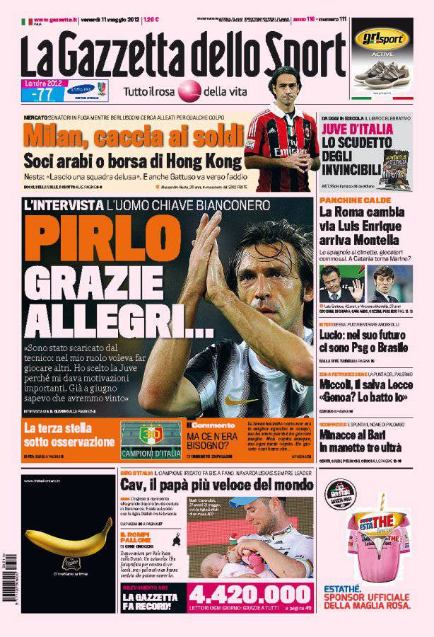 GAZZETTA PIRLO ALLEGRI – Sulla Gazzetta dello Sport intervista a Pirlo, centrocampista della Juventus, che ringrazia Allegri per averlo scaricato.
