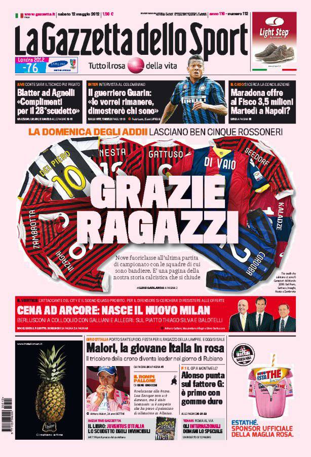 GAZZETTA CAMPIONATO – L’ultima giornata di questo campionato sarà anche l’ultima di molti campioni come Nesta, Gattuso, Seedorf, Inzaghi, Zambrotta, Del Piero, Cordoba, Di Vaio.