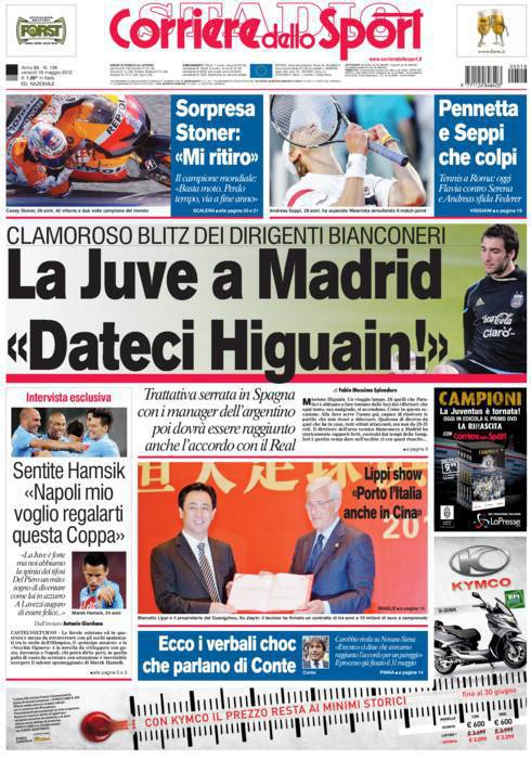 CORRIERE JUVENTUS HIGUAIN – Sul Corriere dello Sport si parla di Higuain, attaccante del Real Madrid, finito nel mirino della Juventus.