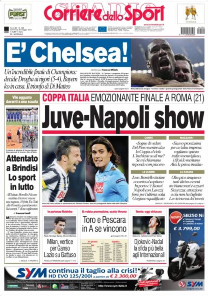 CORRIERE DELLO SPORT JUVE NAPOLI SHOW – Scelta editoriale diversa per il Corriere dello Sport che decide di guardare al calcio di casa nostra nella sua prima pagina. Alle 20.45, allo stadio Olimpico di Roma, si disputerà la finale di Coppa Italia tra Juventus e Napoli.