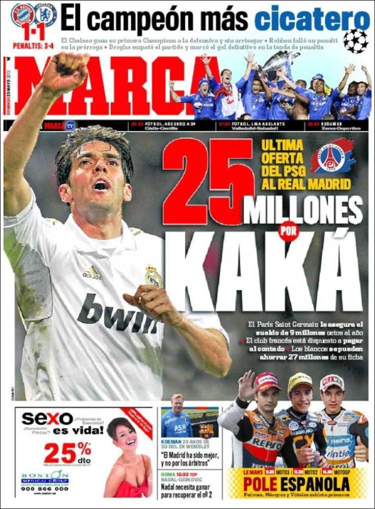 MARCA 25 MILIONI KAKA’ – Il quotidiano spagnolo Marca, apre stamani con l’ultima offerta del Paris Saint Germain per il fantasista del Real Madrid, Ricardo Kakà. I Parigini avrebbero offerto 25 milioni di euro per il cartellino dell’ex Milan.