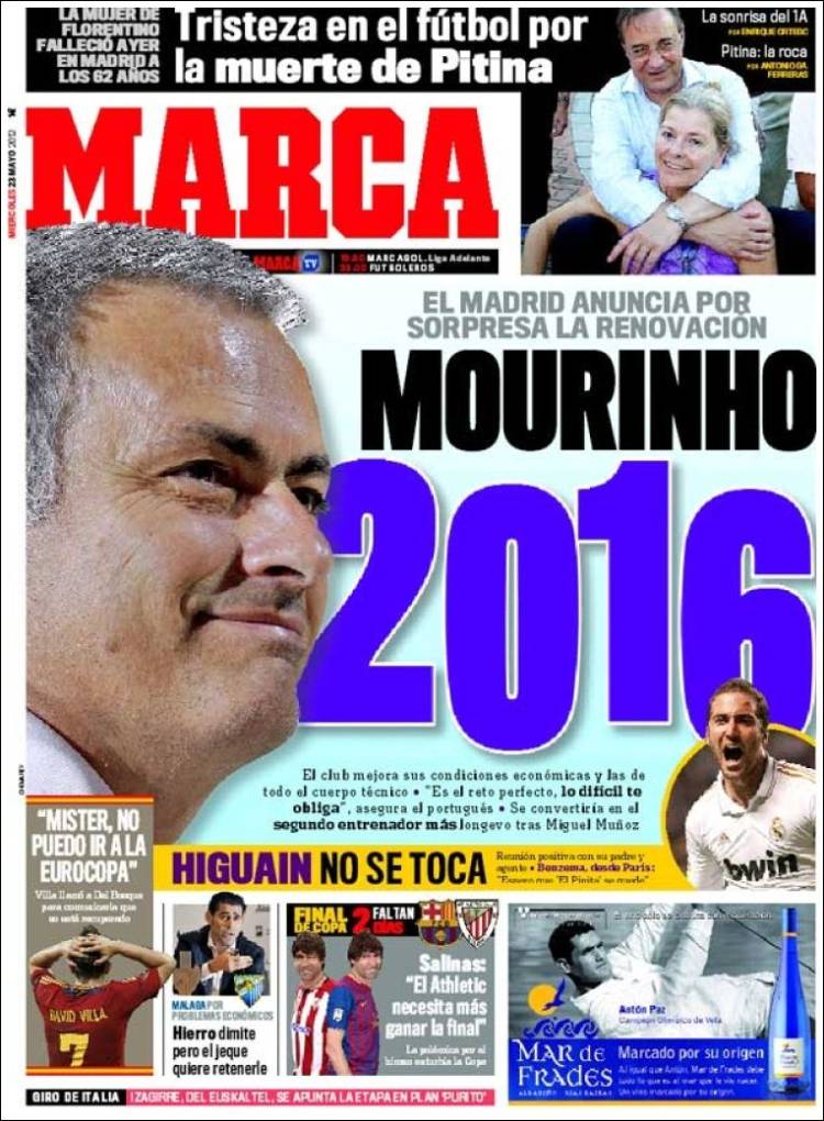 MARCA MOURINHO 2016 – Con un comunicato apparso ieri a sorpresa sul sito del Real Madrid, è stato comunicato il rinnovo del contratto di Josè Mourinho che prolunga il suo rapporto con la squadra Spagnola fino al 2016.