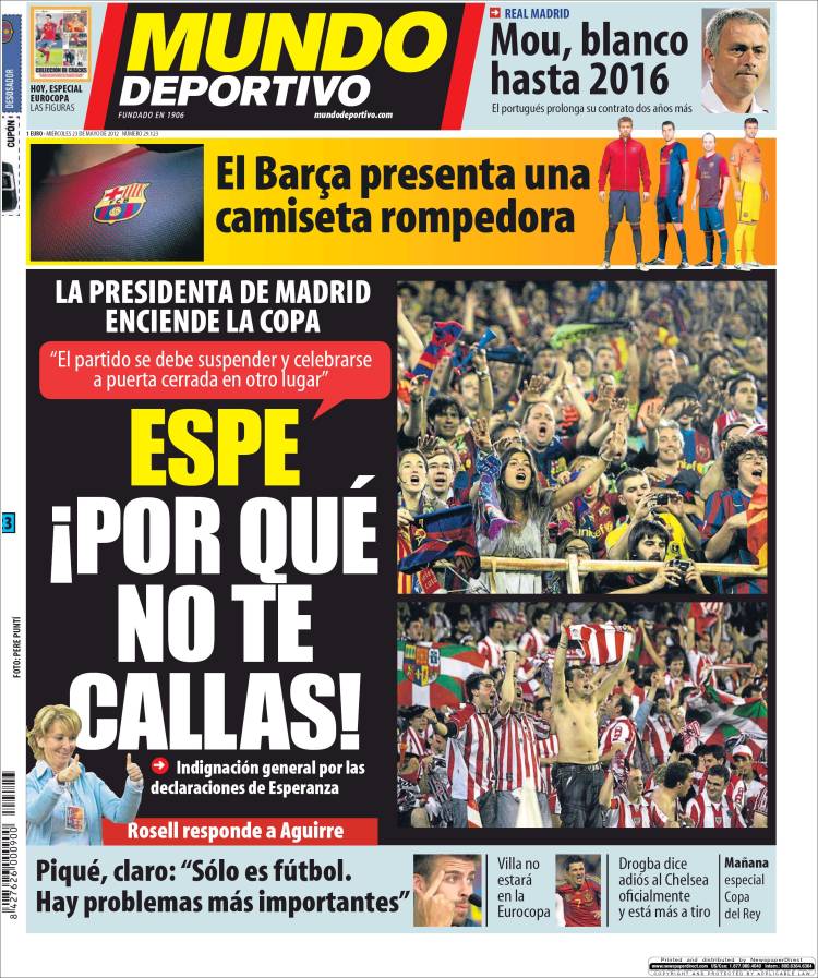 MUNDO DEPORTIVO ESPE STAI ZITTA – Anche in Spagna non si placano affatto le polemiche all’interno del mondo del Calcio. Esperanza Aguirre, presidentessa del partito popolare Madrileno, aveva chiesto di far giocare la finale di Copa de Rey tra Barça ed Athletic Bilbao a porte chiuse, a causa dei probabili fischi dei tifosi Catalani e Baschi all’inno nazionale Spagnolo. Netta la protesta del quotidiano Mundo Deportivo.
