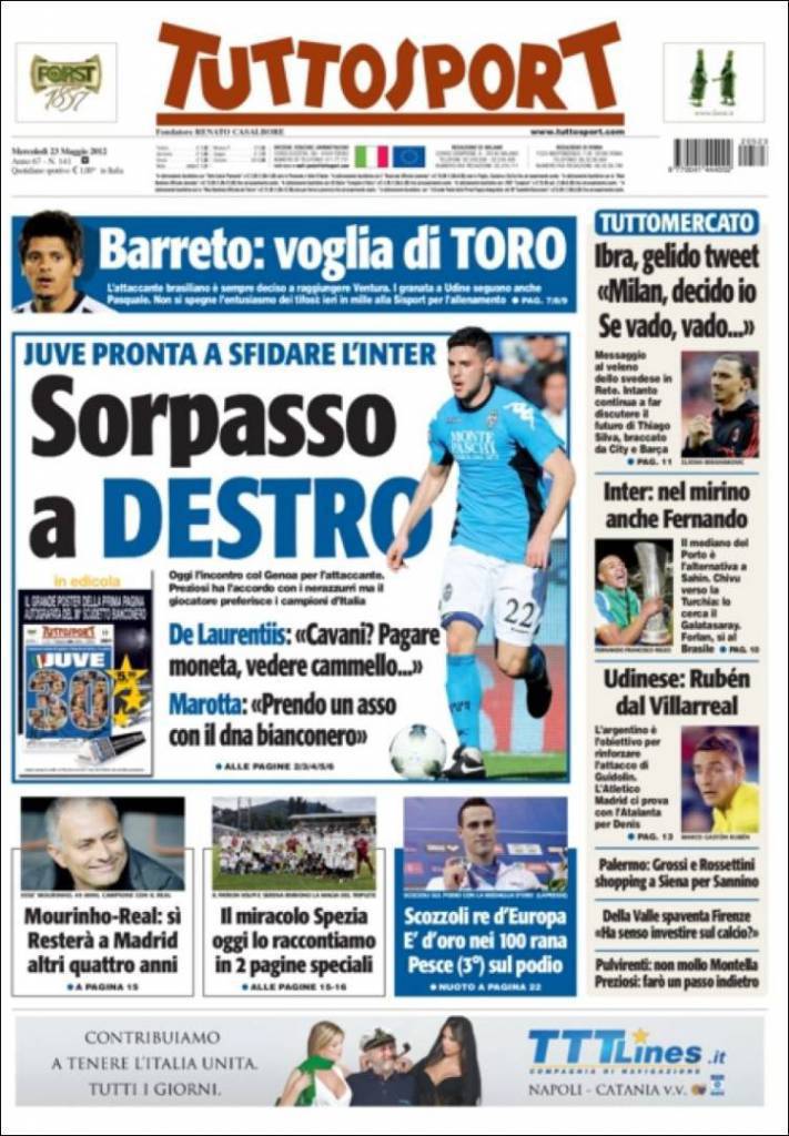 TUTTOSPORT SORPASSO DESTRO – Il quotidiano Torinese Tuttosport, apre stamani con la notizia di un sorpasso della Juventus ai danni dell’Inter nella trattativa per Mattia Destro.