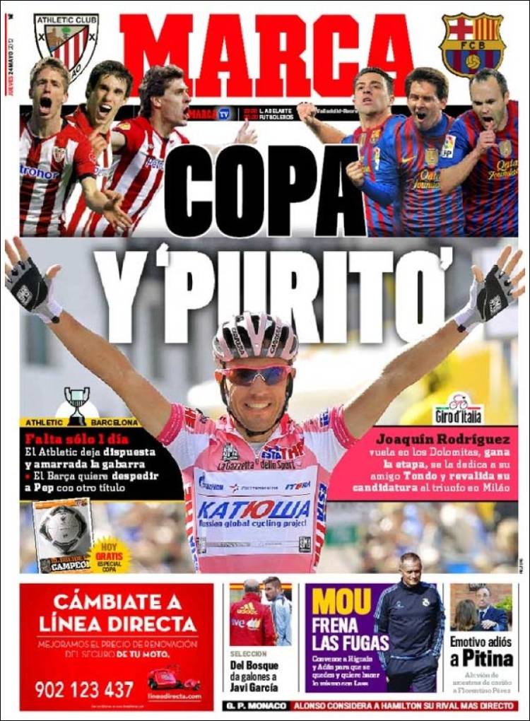 MARCA COPPA – Sul quotidiano Marca si parla sia della finale di Copa del Rey tra Atletico Bilbao e Barcellona e sia per il Giro d’Italia che ha visto protagonista Rodriguez.